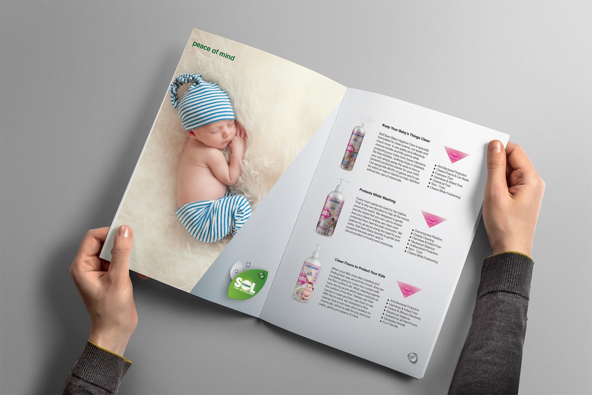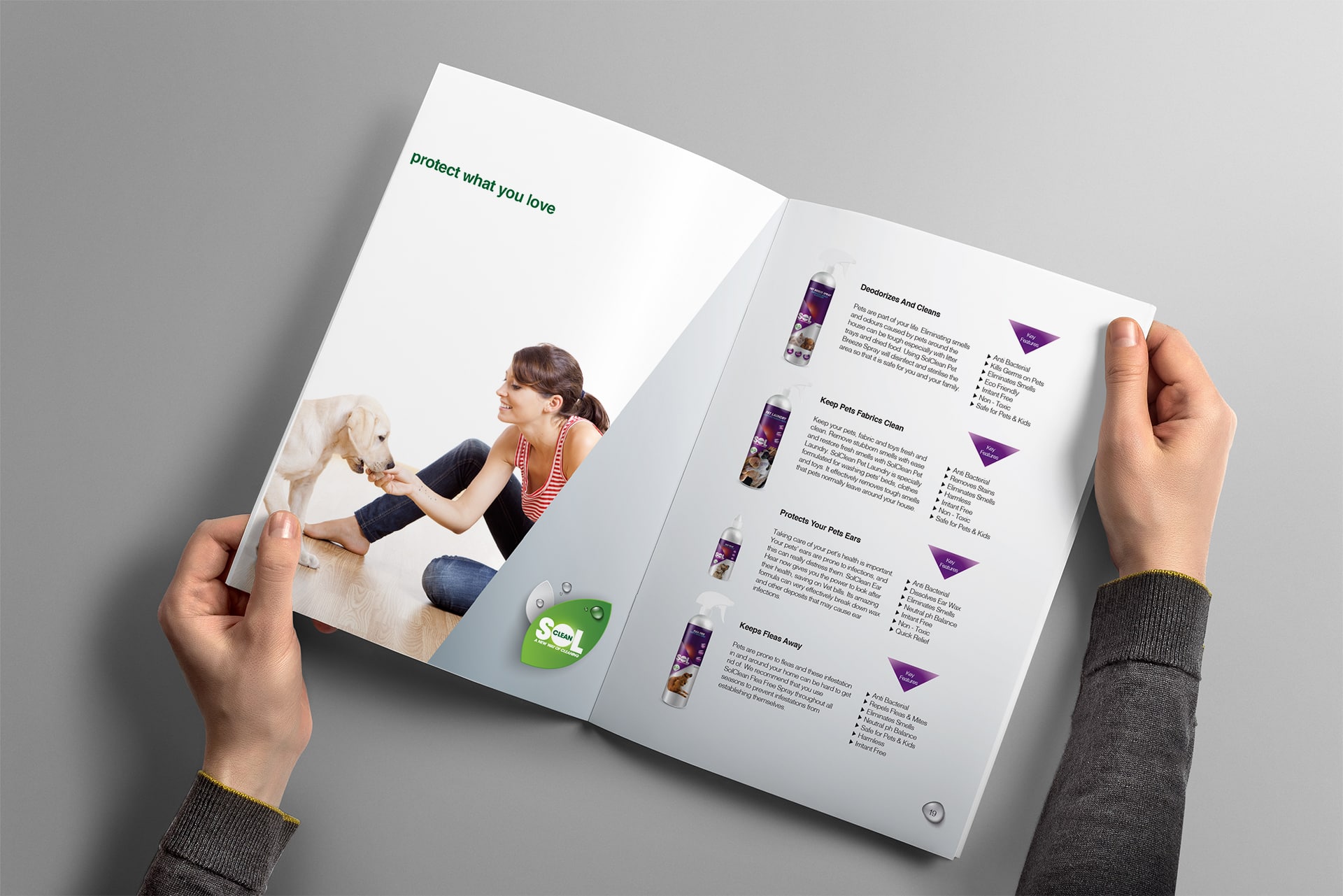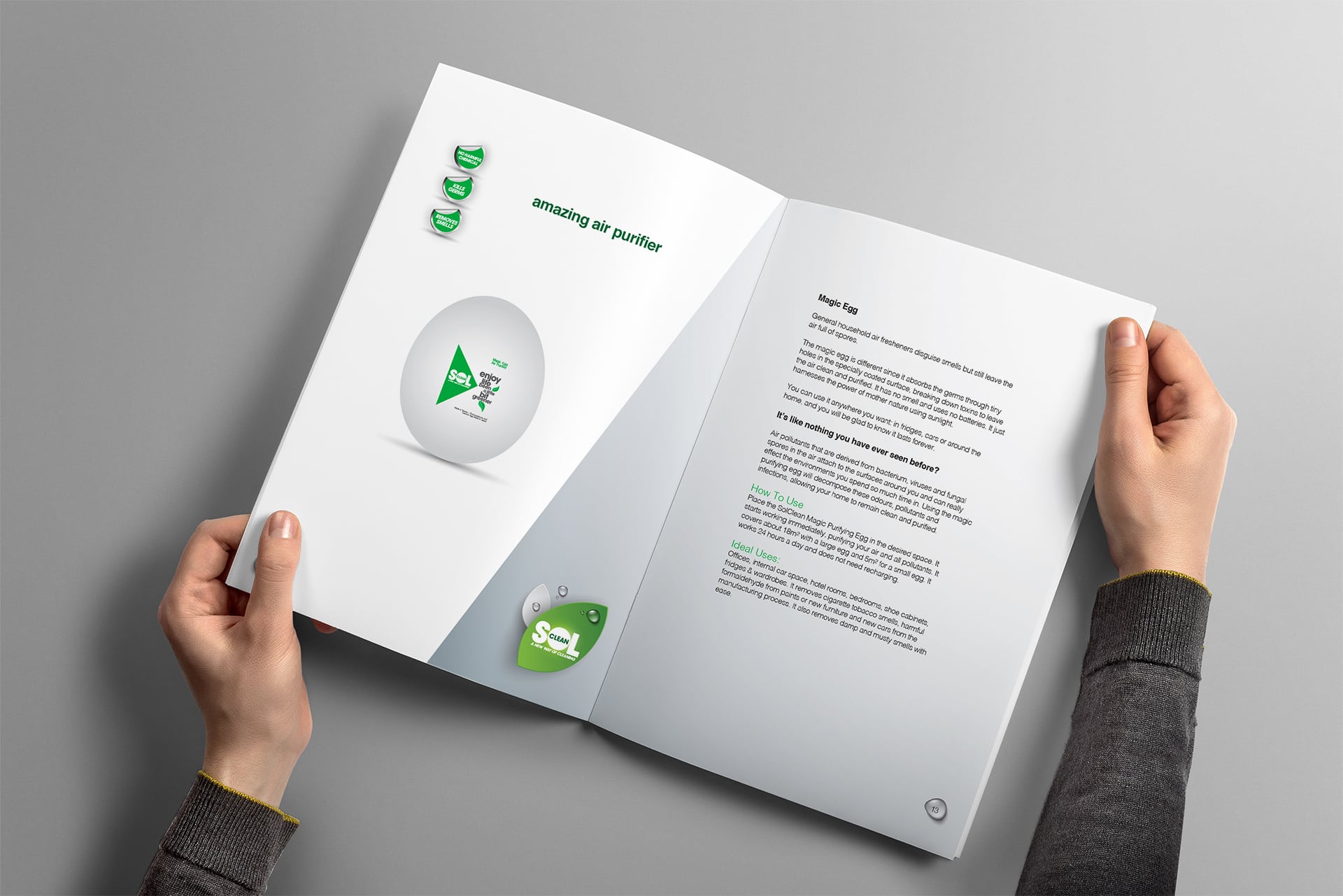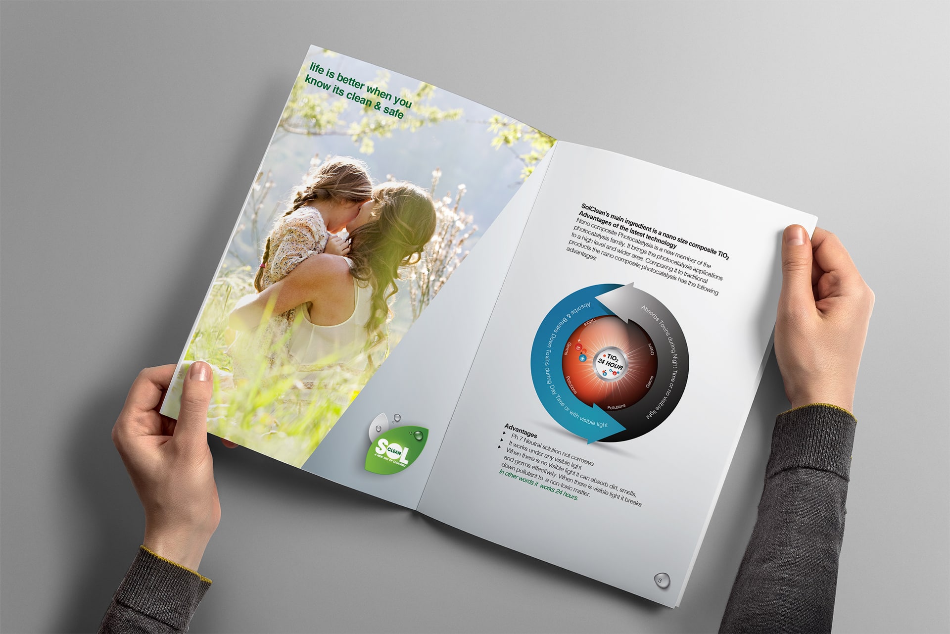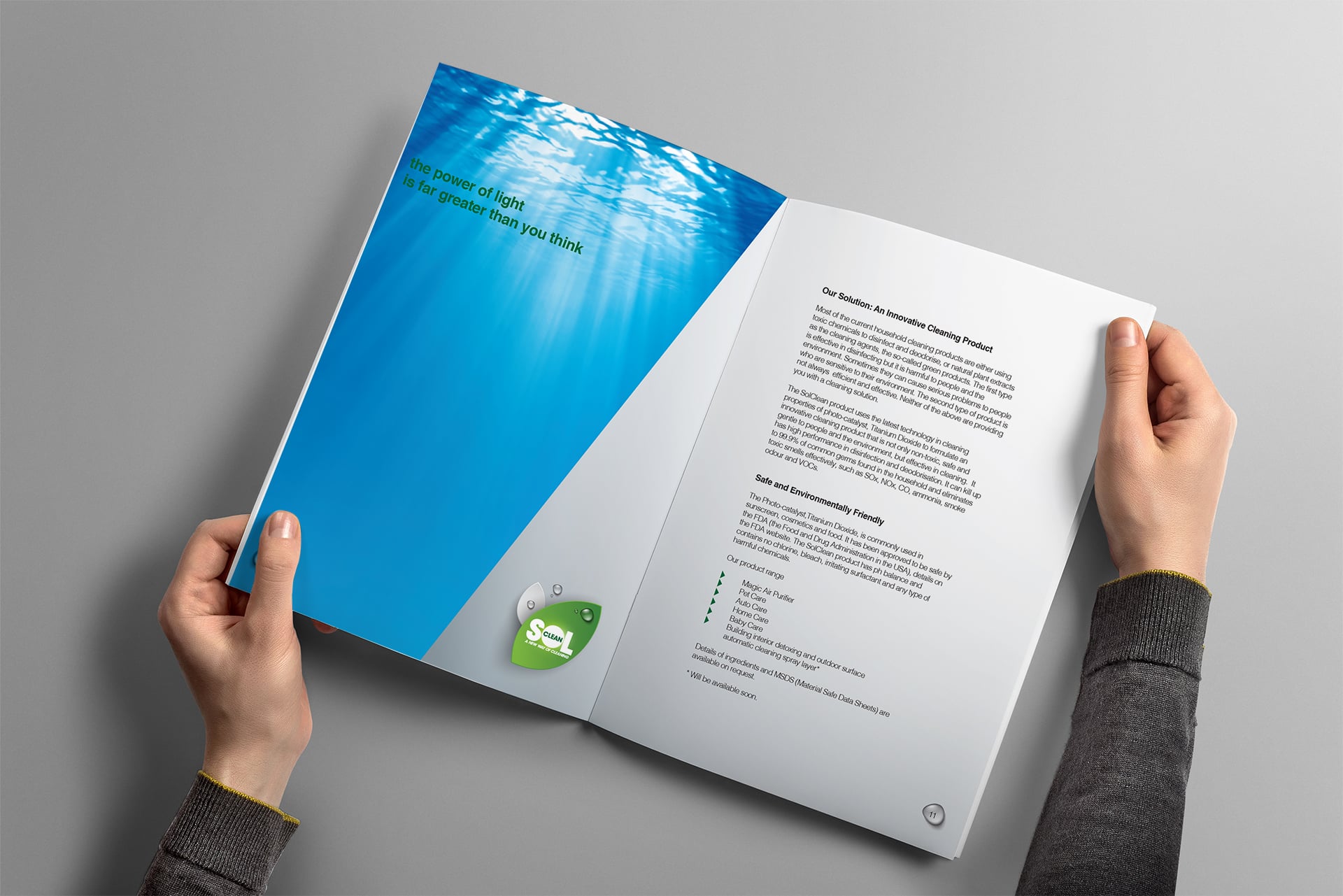 Our product range includes an Air Purifier, Home Care, Baby Care, Pet Care and Auto Care series. They do not contain chlorine, bleach, irritating surfactant, sodium hydroxide, sodium lauryl sulphite, phthalates, ammonia, artificial fragrance, brightening agent, added enzyme, parabens and any other harmful chemicals. The key ingredient of our SolClean product, Titanium Dioxide, is a naturally occurring oxide of Titanium. It is chemically stable and has been approved to be environmental friendly and safe by the FDA (Food and Drug Administration, USA).